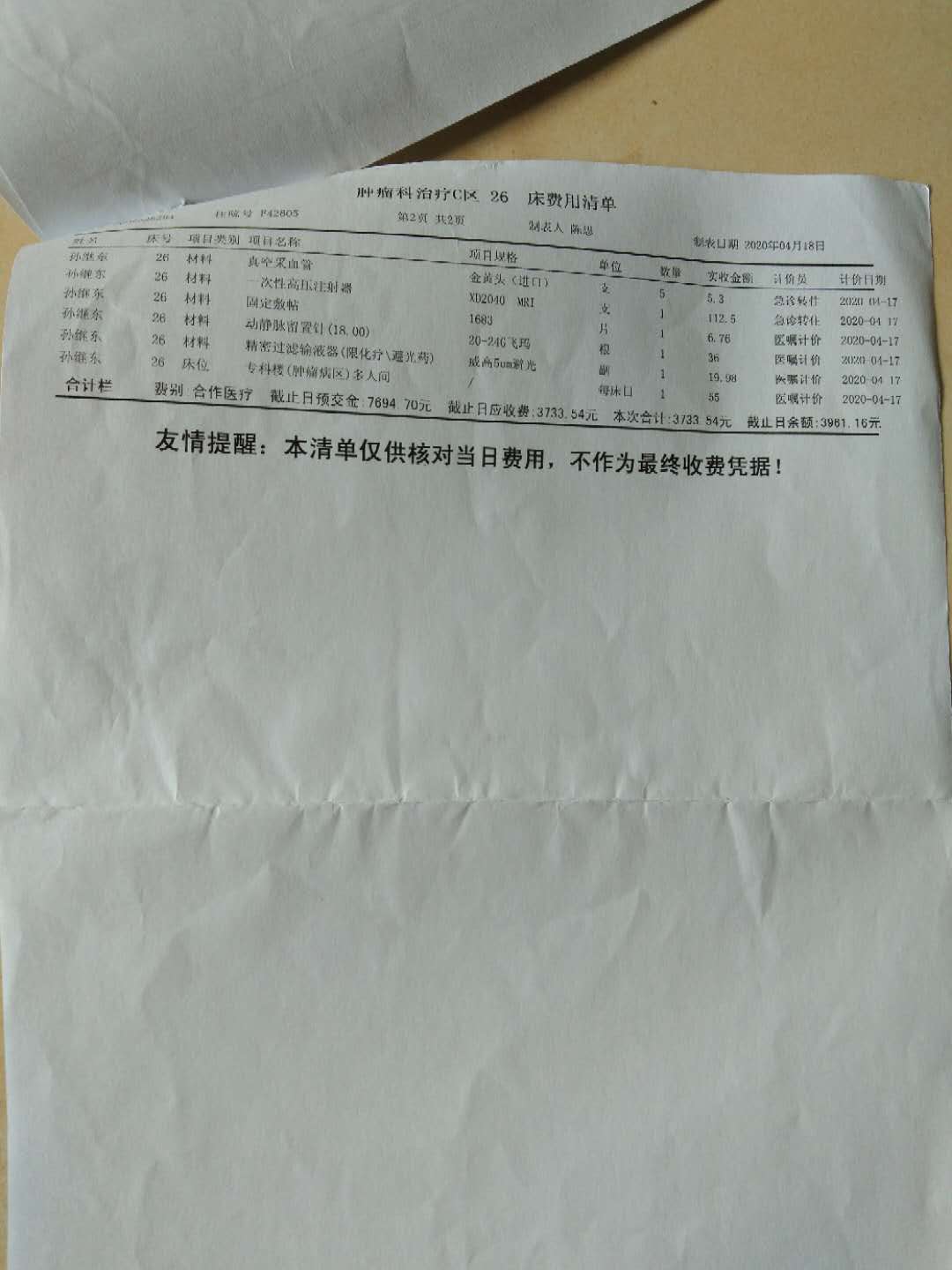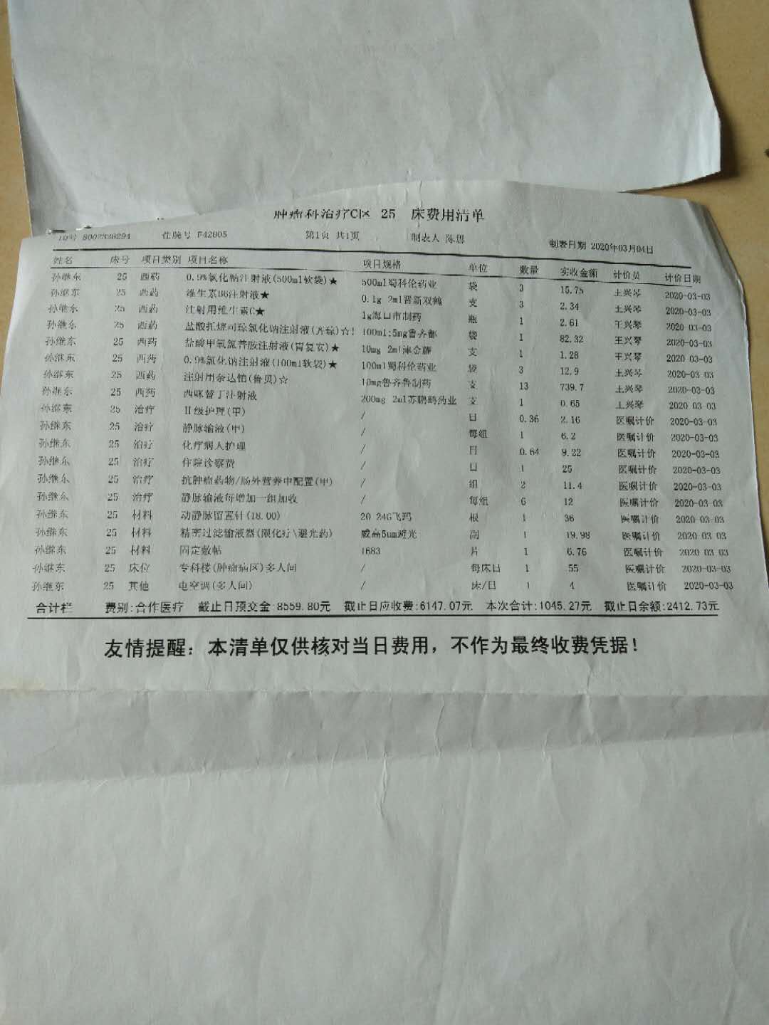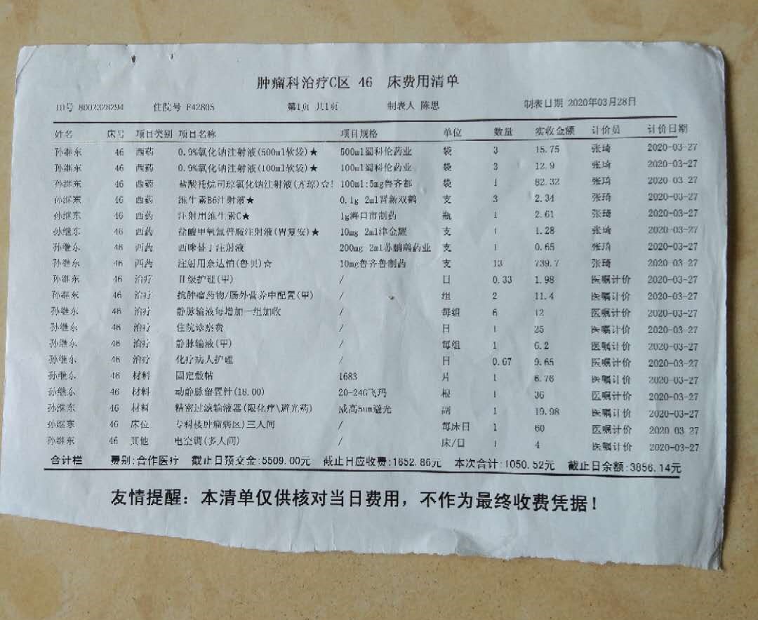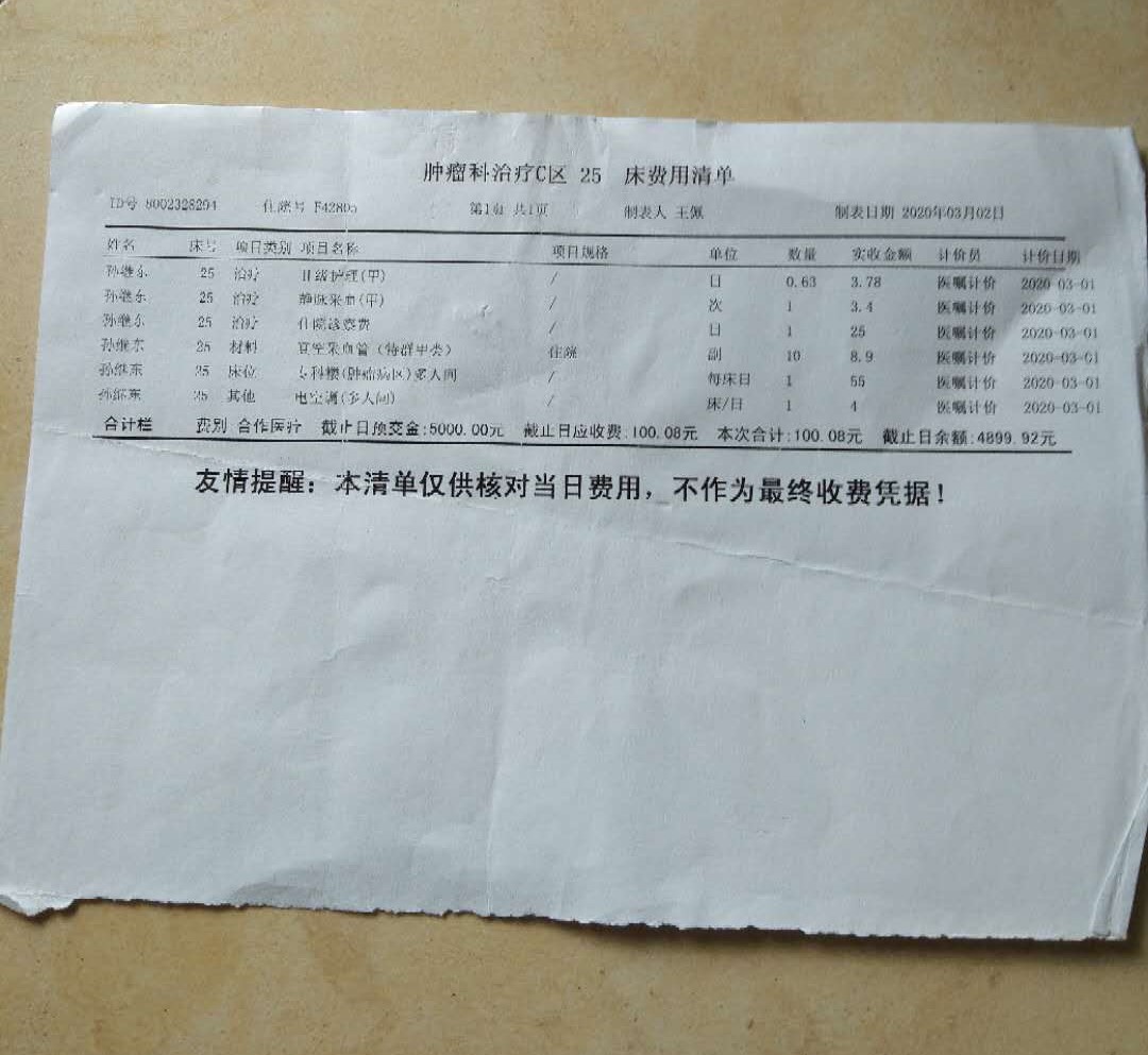 “刚开始没在想这么多,我一直有鼻炎的症状,就没想这么多,直到今年年初经常流鼻血,他们非让我去检查,才发现是鼻咽癌。”孙继东说,“医生建议的是化疗和放疗,从查出来到现在,我化疗了三次,放疗二十几次了,只有化疗的时候是住院,其余治疗都是门诊,我们自己都花了6万多了,很多都是亲戚借的。”