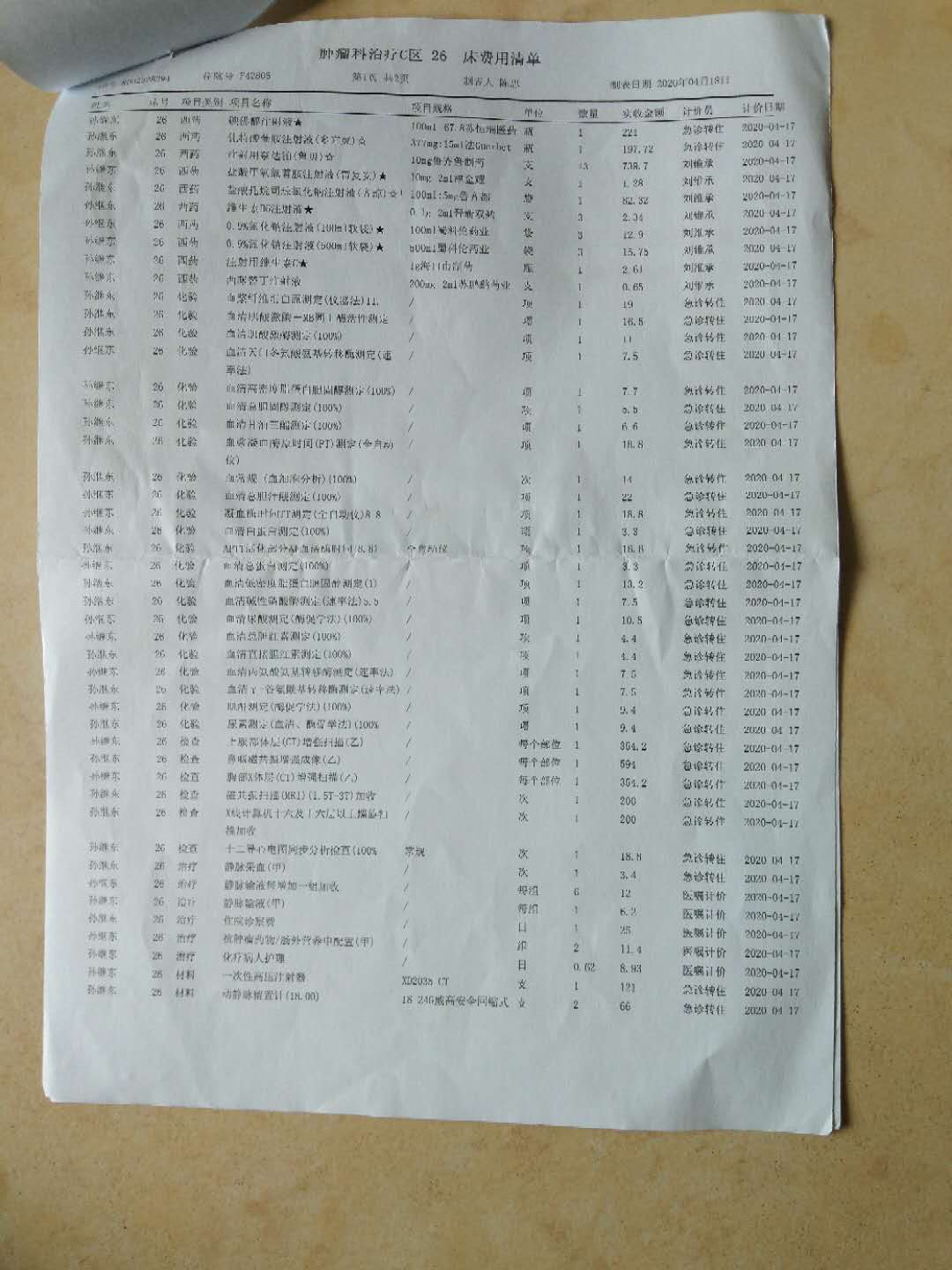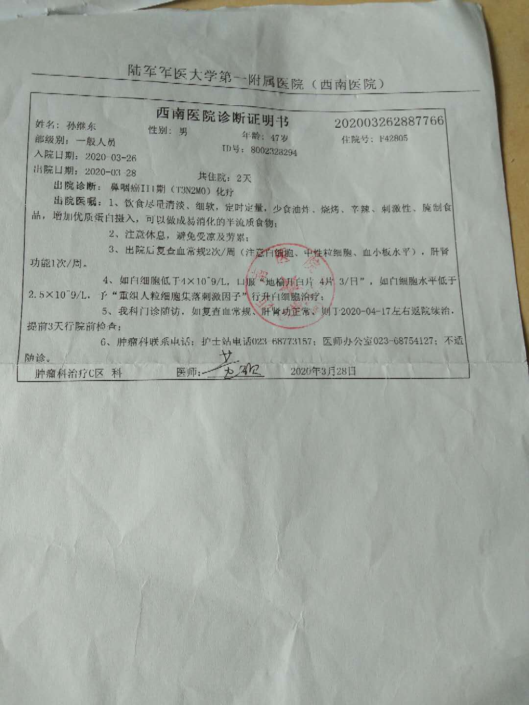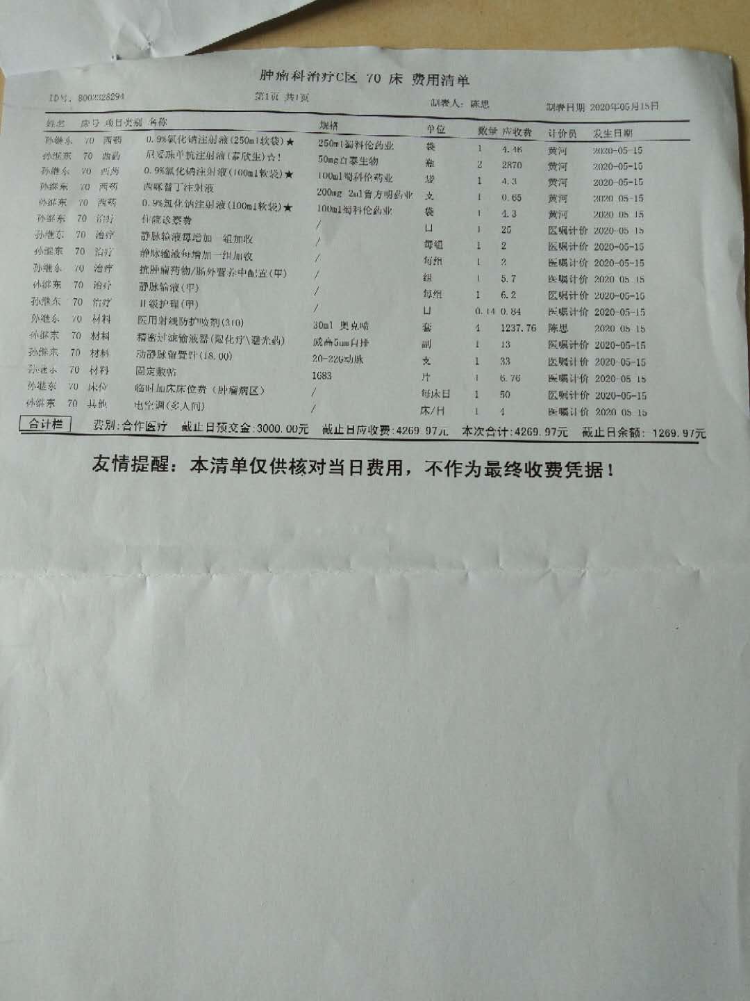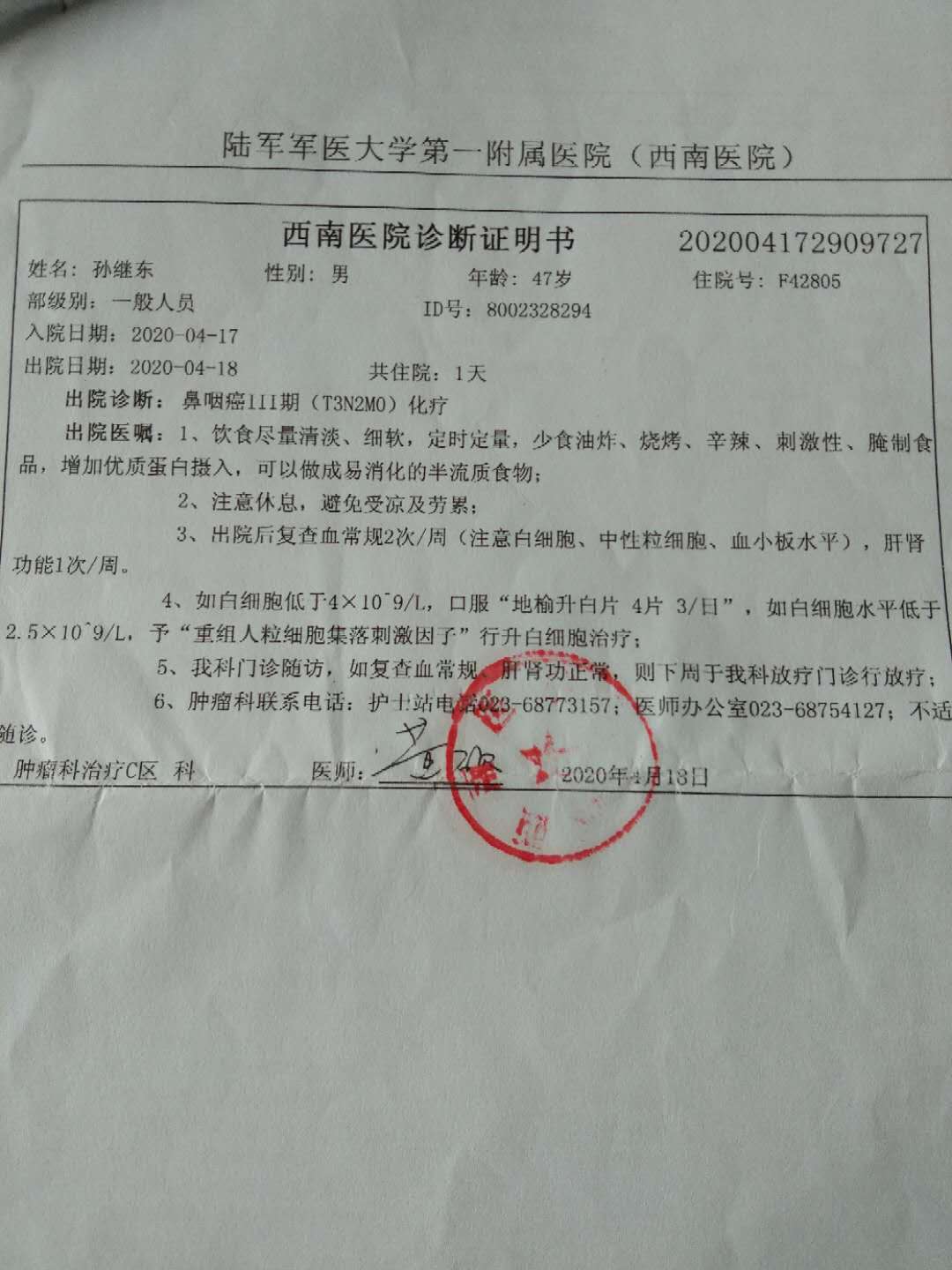 “刚开始没在想这么多,我一直有鼻炎的症状,就没想这么多,直到今年年初经常流鼻血,他们非让我去检查,才发现是鼻咽癌。”孙继东说,“医生建议的是化疗和放疗,从查出来到现在,我化疗了三次,放疗二十几次了,只有化疗的时候是住院,其余治疗都是门诊,我们自己都花了6万多了,很多都是亲戚借的。”